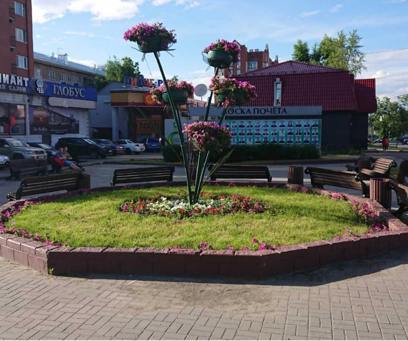Малые архитектурные формы в этом сквере совмещают в себе вазоны для растений и лавочки. Таким образом в сквере достаточно свободного пространства для людей и их перемещений.